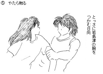 その後も肩に手をかける、歩き出す際に腰に手を当てる、日向が怒って飛び出したのを若島津が追いかけていって二人とも戻ってこない(しばらく経ってから一緒に現れる)等、気になる表現が続きます。こんな描写は他のキャラにはまったくありません。