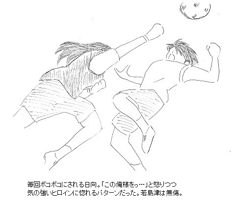 日向も貧乏ネタが省略されてるせいか、まるで影のないやんちゃ坊主にしか見えない(私が描くのもそんな風なので文句は言えませんが)。若島津の方が「強すぎて孤高の存在だった」とあらすじにあり、性格もなんだか浮世離れしてます。天女が人間の男に惹かれる感じ?