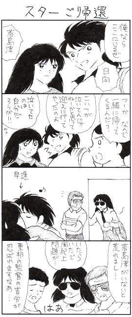 あれだけ大騒ぎしといて、若島津といちゃいちゃ帰ってくるって何?とか思わんもんですかね、みんな。失踪しないだけマシということか。しかしコジケン漫画なのに石崎とか見上とか片桐とかばっかですいません(片桐は3話連続登場)。ちなみに最後のコマの左の人物は全日本のコーチです。誰も知らんわこんなオッサン。